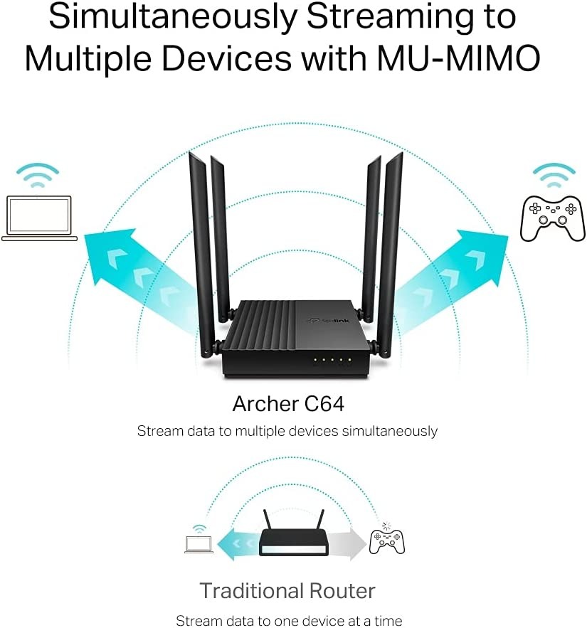 TP-Link Archer C64 AC1200 1200mbps Dual-Band Wireless MU-MIMO Gigabit WiFi Router The TP-Link Archer C64 allows you to connect more devices and stream simultaneously with its dual 2.4GHz and 5GHz bands. The 2.4GHz band provides reliable connections for sending emails, web browsing, and other simple tasks. The 5GHz band delivers speeds up to 867Mpbs, great for media-intense applications like video streaming and online gaming. It comes with 4 high-performance external antennas, Archer C64 boosts WiFi signals throughout your home. Beamforming technology detects devices and concentrates wireless signal strength towards them, particularly for previously hard-to-reach outlets. It supports simultaneously Streaming to Multiple Devices with MU-MIMO. It establishes multiple simultaneous connections for you to enjoy higher speeds and greater stability. Gigabit Ethernet ports (1 WAN+ 4 LAN) deliver speeds up to 10 Ãâ faster than standard Ethernet connections. Plug it in your PCs, smart TVs, and game consoles for fast and reliable connections. Archer C64 is your best choice for high-performance Gigabit network entry, with a competitive price advantage, full Gigabit Ethernets ports drive your devices to peak performance.